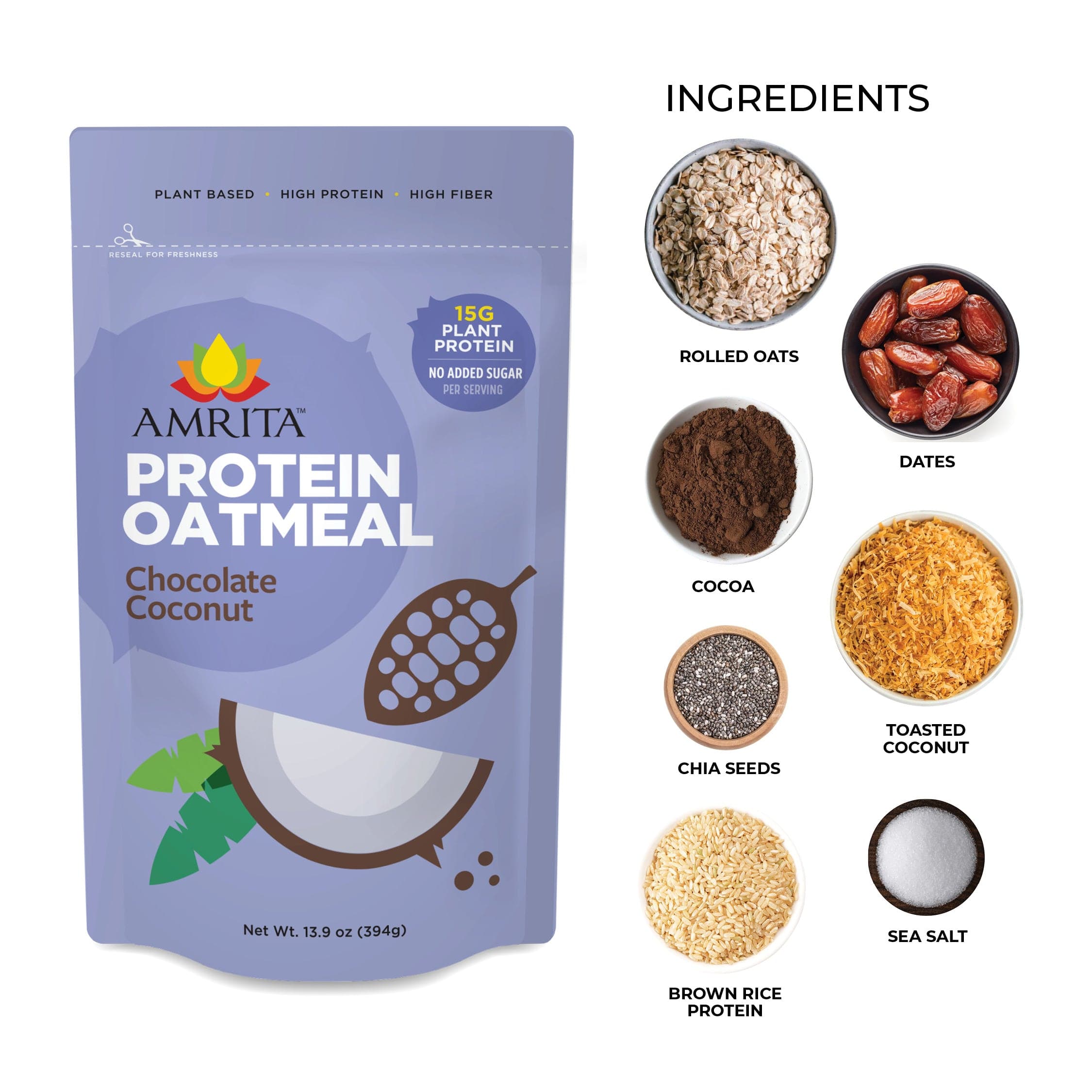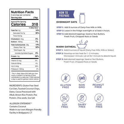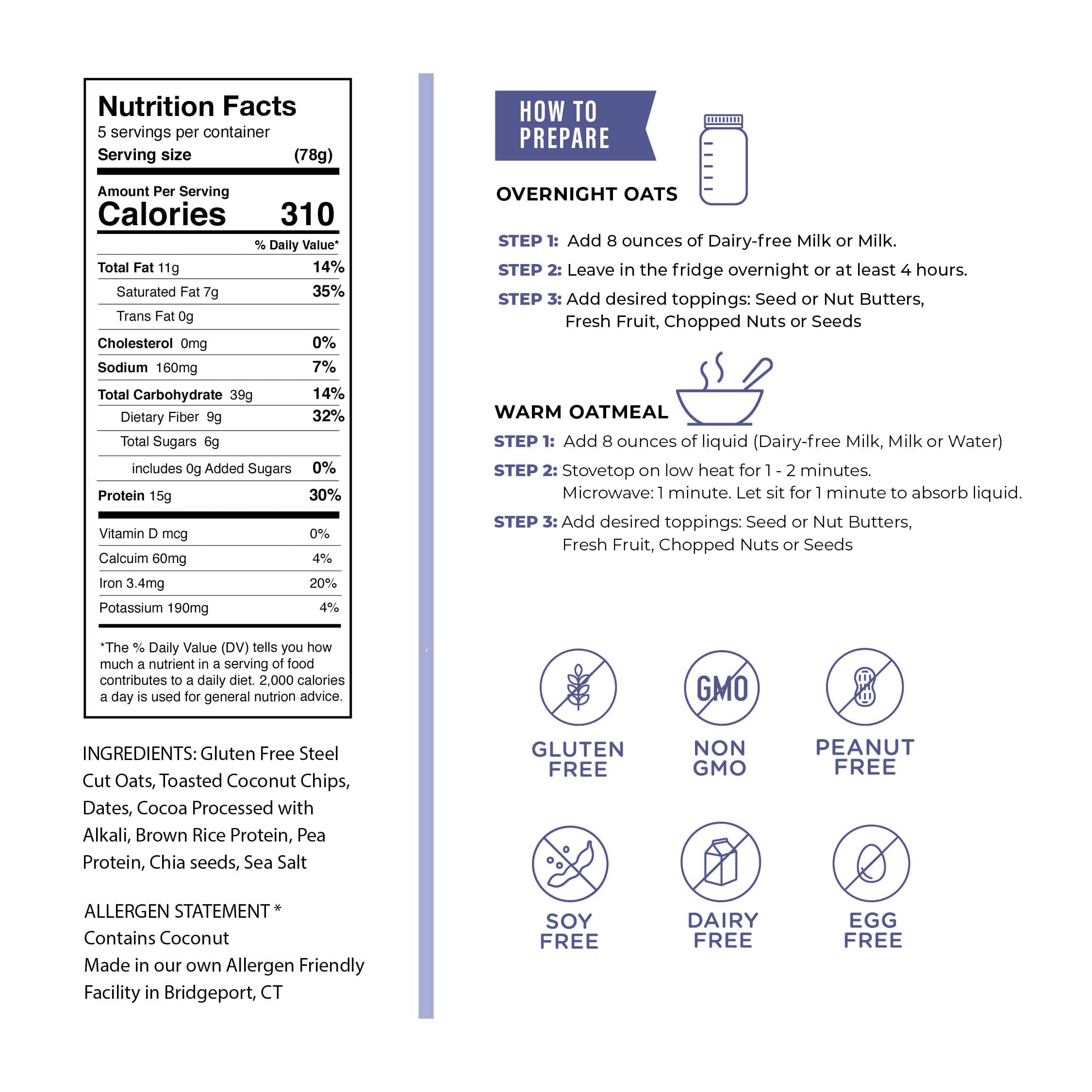 Gluten-free Steel Cut Oats, Toasted Coconut Chips, Dates, Cocoa Processed with Alkali, Brown Rice Protein, Pea Protein, Chia Seeds, Sea Salt