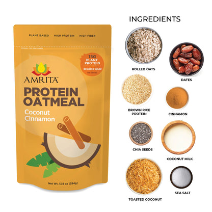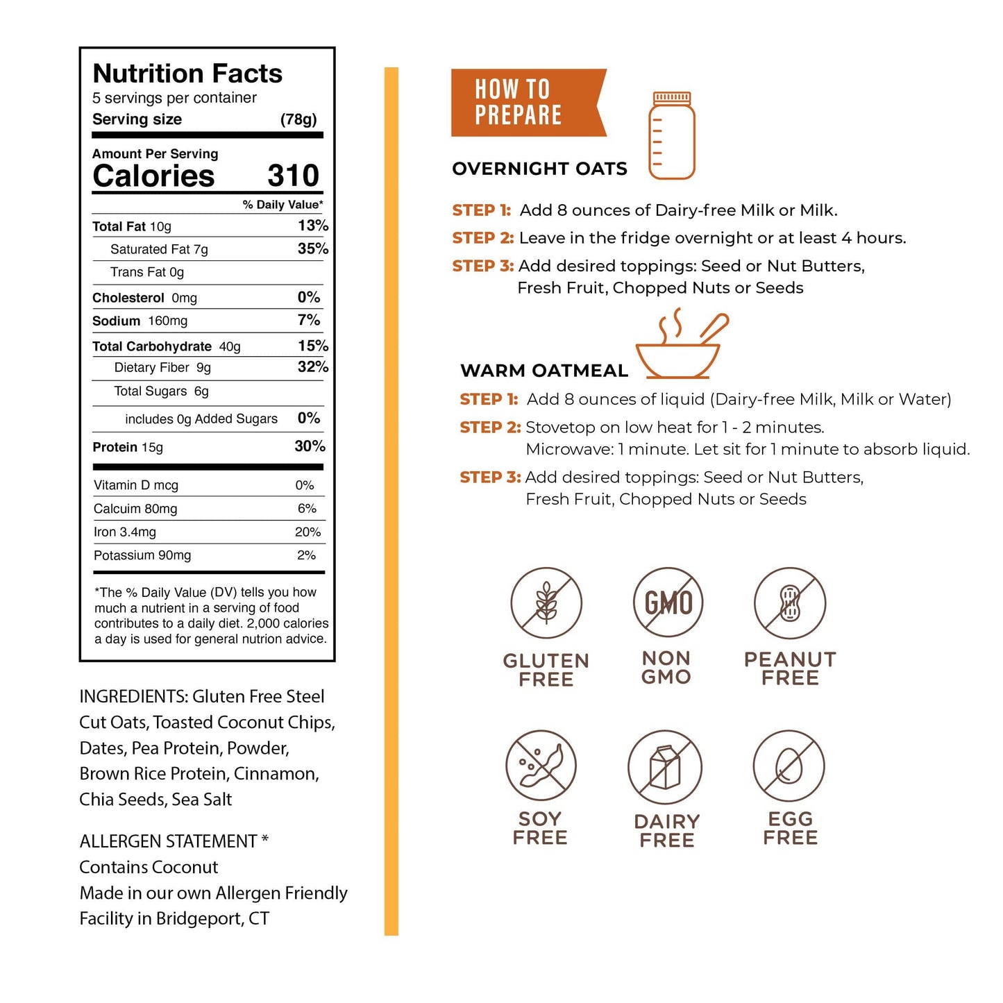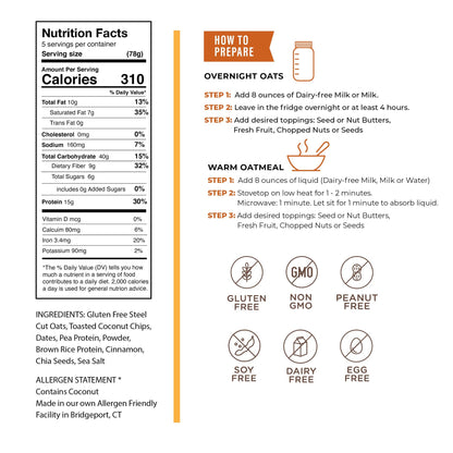Gluten-free Steel Cut Oats, Toasted Coconut Chips, Dates, Brown Rice Protein, Pea Protein, Cinnamon, Chia Seeds, Sea Salt